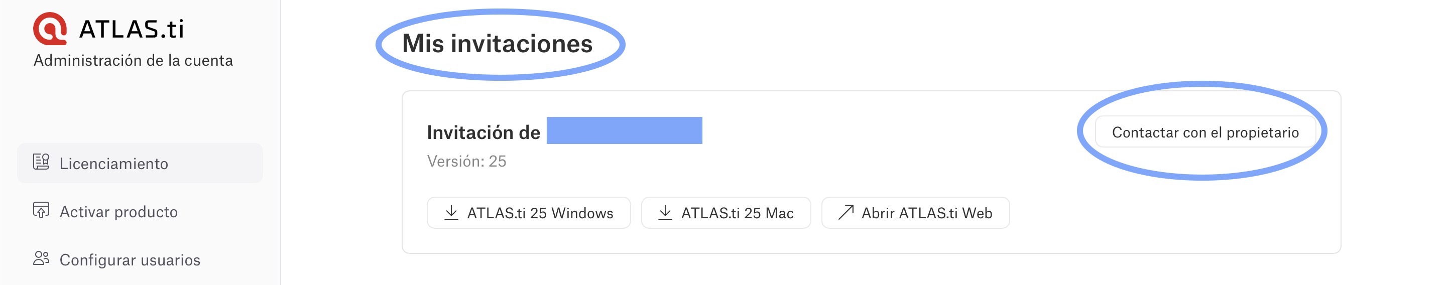 Vaya a https://my.atlasti.com/licenses y desplácese hasta el final de la página, a la sección Mis invitaciones. Habrá una entrada para cada organización a la que pertenezca, pero normalmente sólo será miembro de una organización.