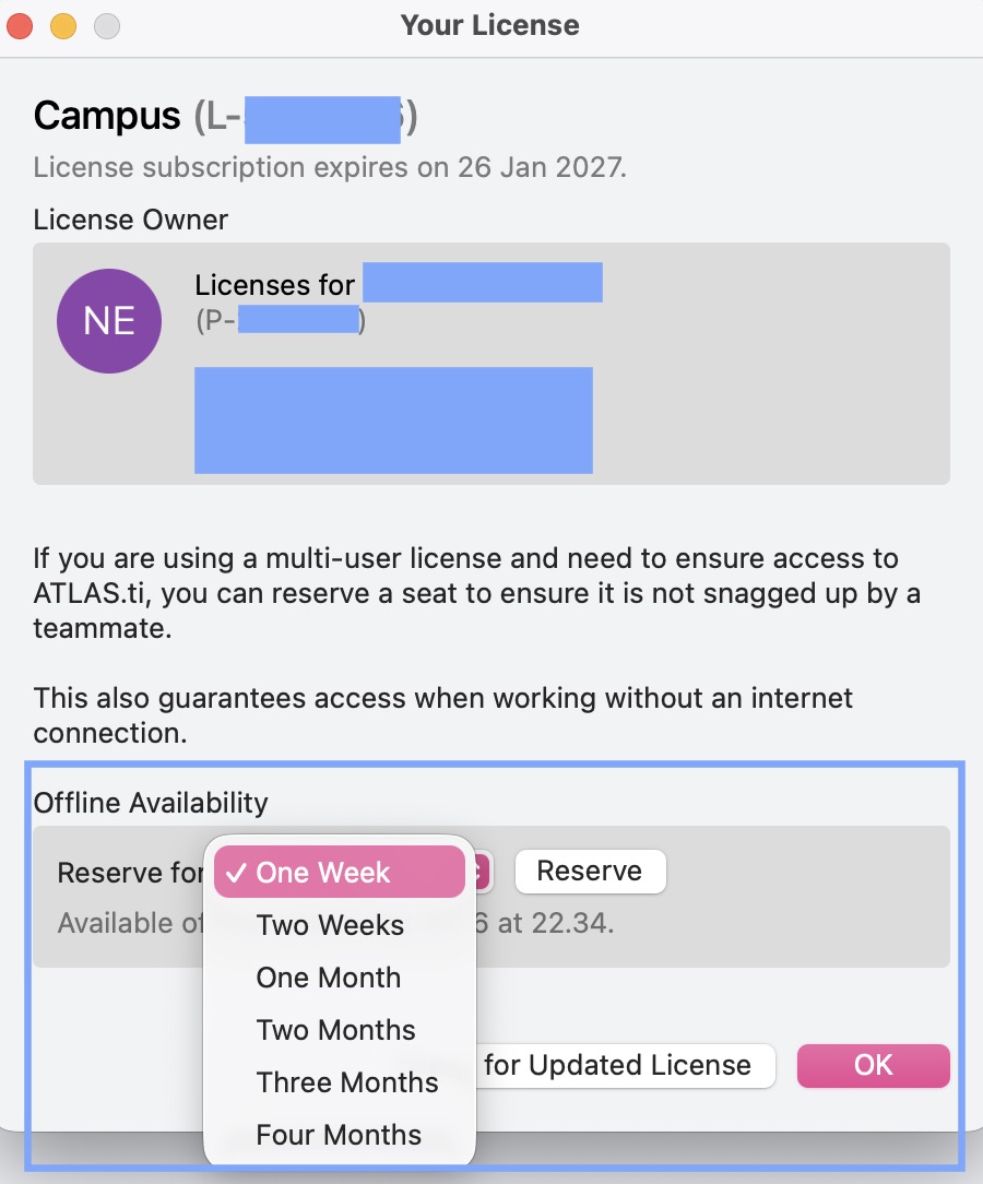 Estoy trabajando en mi disertación o en algún otro trabajo muy importante. ¿Cómo puedo asegurarme y reservar una licencia de mi organización, para no acabar en una situación en la que todas las licencias están en uso una hora antes de que deba terminar mi trabajo?